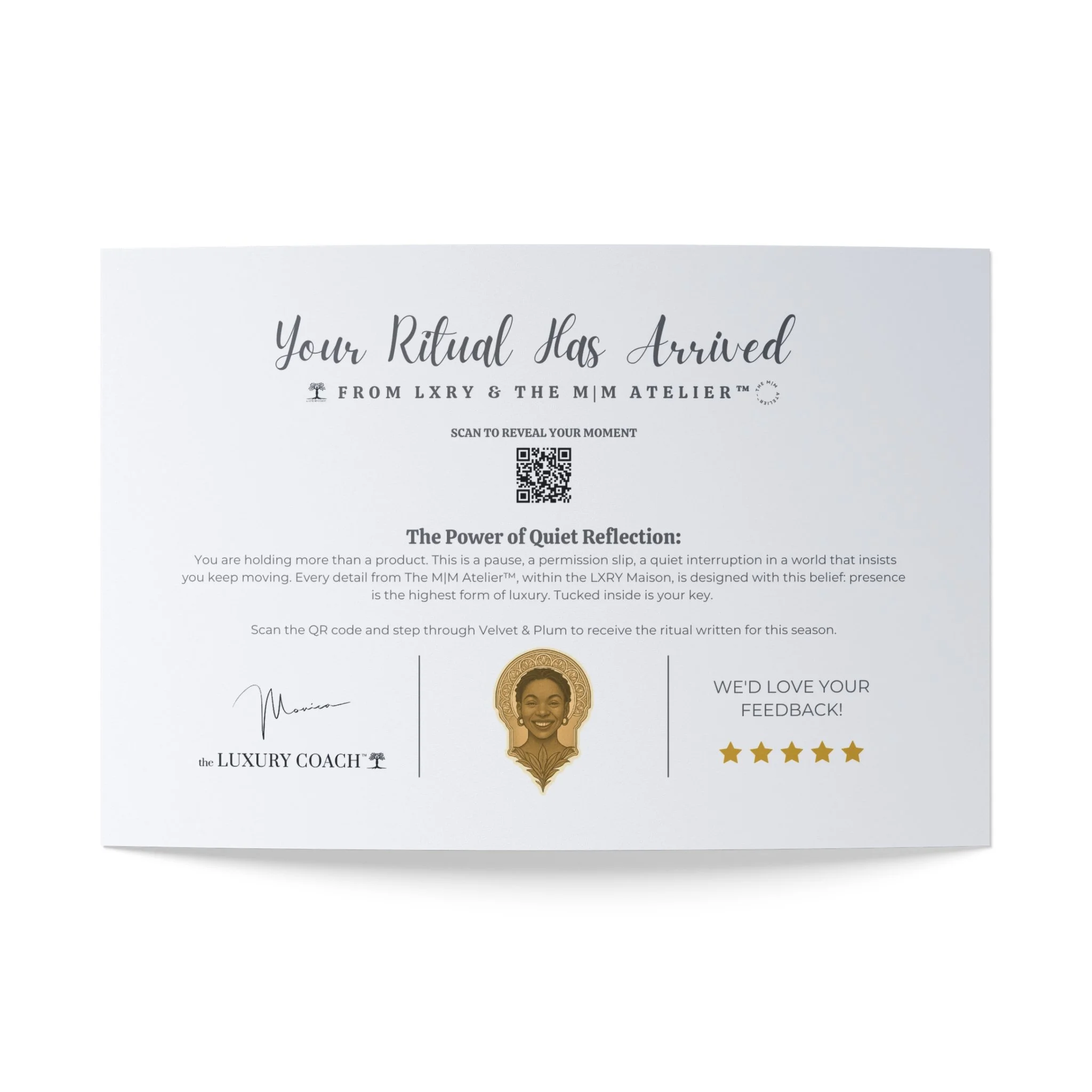 Inside your package, you’ll discover a keepsake card — discreet, refined, and meant only for you. On it rests your private QR code, unlocking a narrated ritual by Soléna Wren.